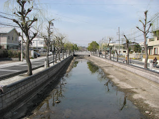 吉田神社から少し西に歩くと、小川の流れる緑地があります。