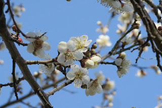 写りがよくないがメジロと思われるつがいが、梅の花の蜜をついばむ