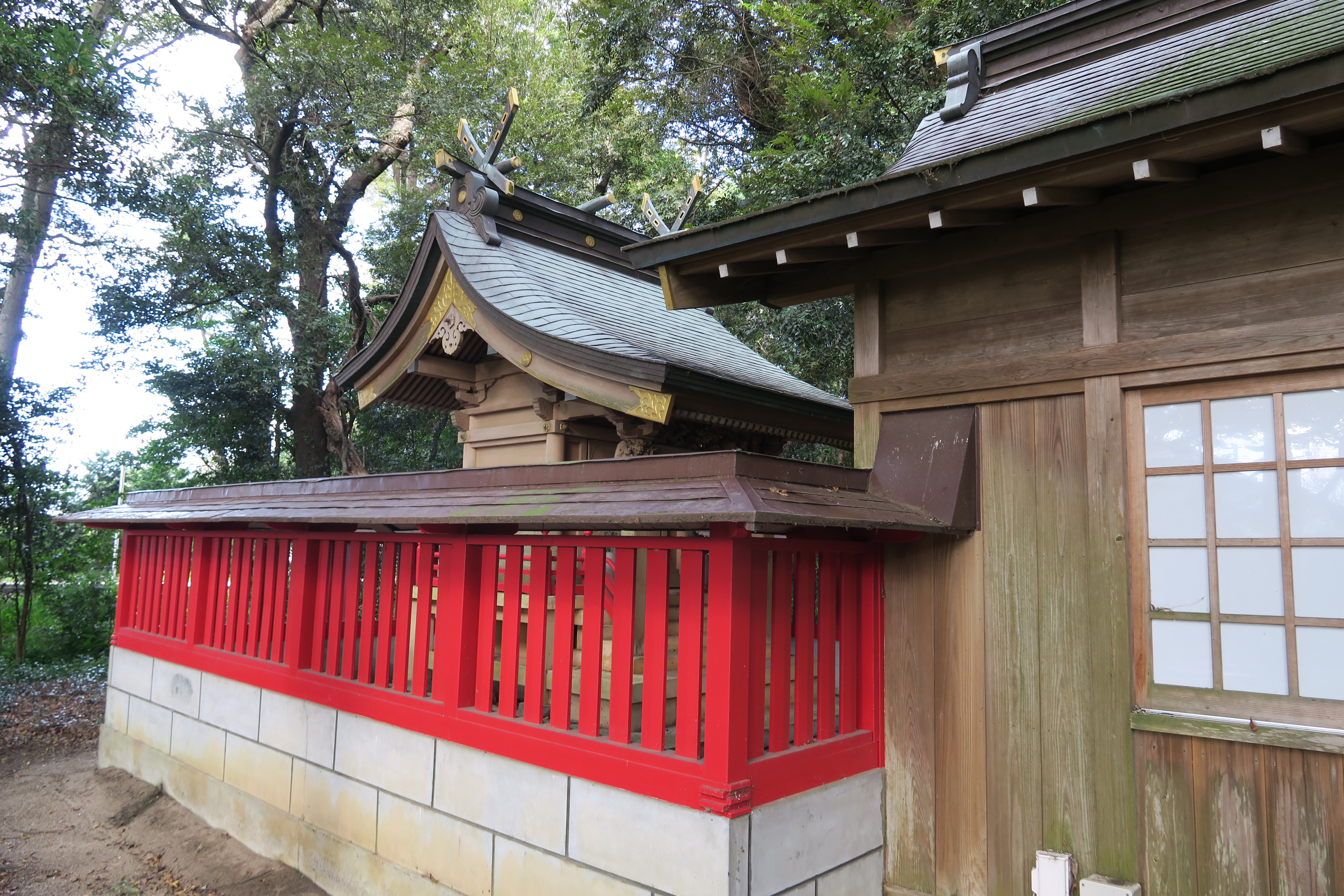 境内社の、鹿島神社、伊邪那岐神社、高房神社、奥宮の4柱合祀社(左)と、香取神社、手子后神社、八龍神社、江神社、若宮の5柱合祀社(右)摂末社の稲荷神社